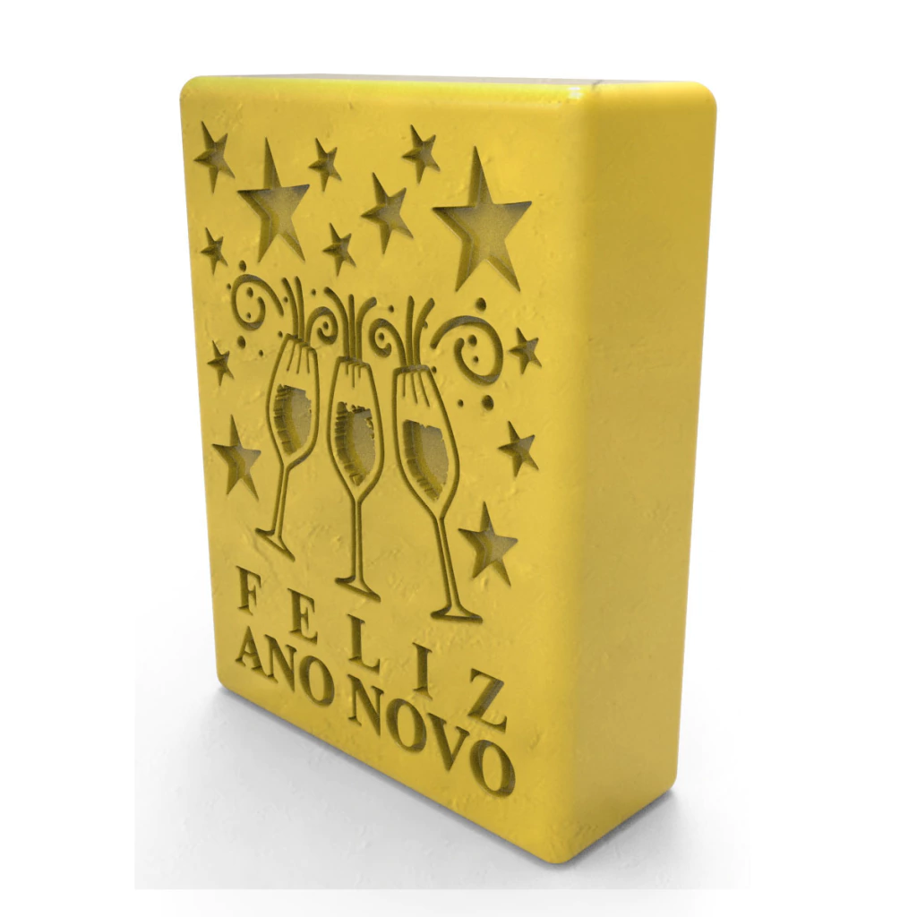 O molde apresenta taças de champagne brindando, capturando o espírito de celebração do Ano Novo. Uma mensagem de "Feliz Ano Novo" está detalhadamente esculpida em baixo relevo, adicionando um toque especial e festivo ao seu projeto.