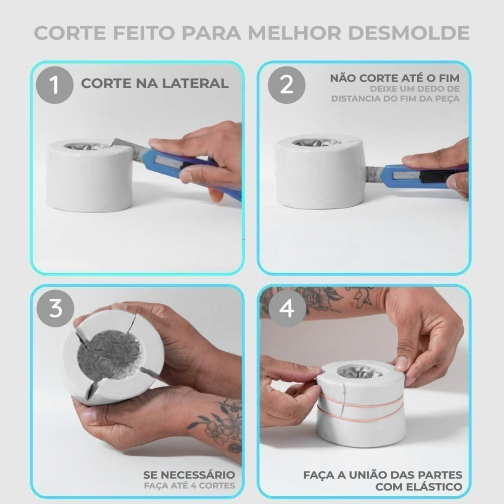 - Alguns modelos, dependendo do formato do corpo da peça, recomendamos que seja feito um corte com estilete na lateral, para que consiga desinformar sem rasgar o molde ou deformar a peça, fique tranquilo você não irá perder sua forma, com um elástico envolva o molde para não vazar o material inserido nos próximos usos.