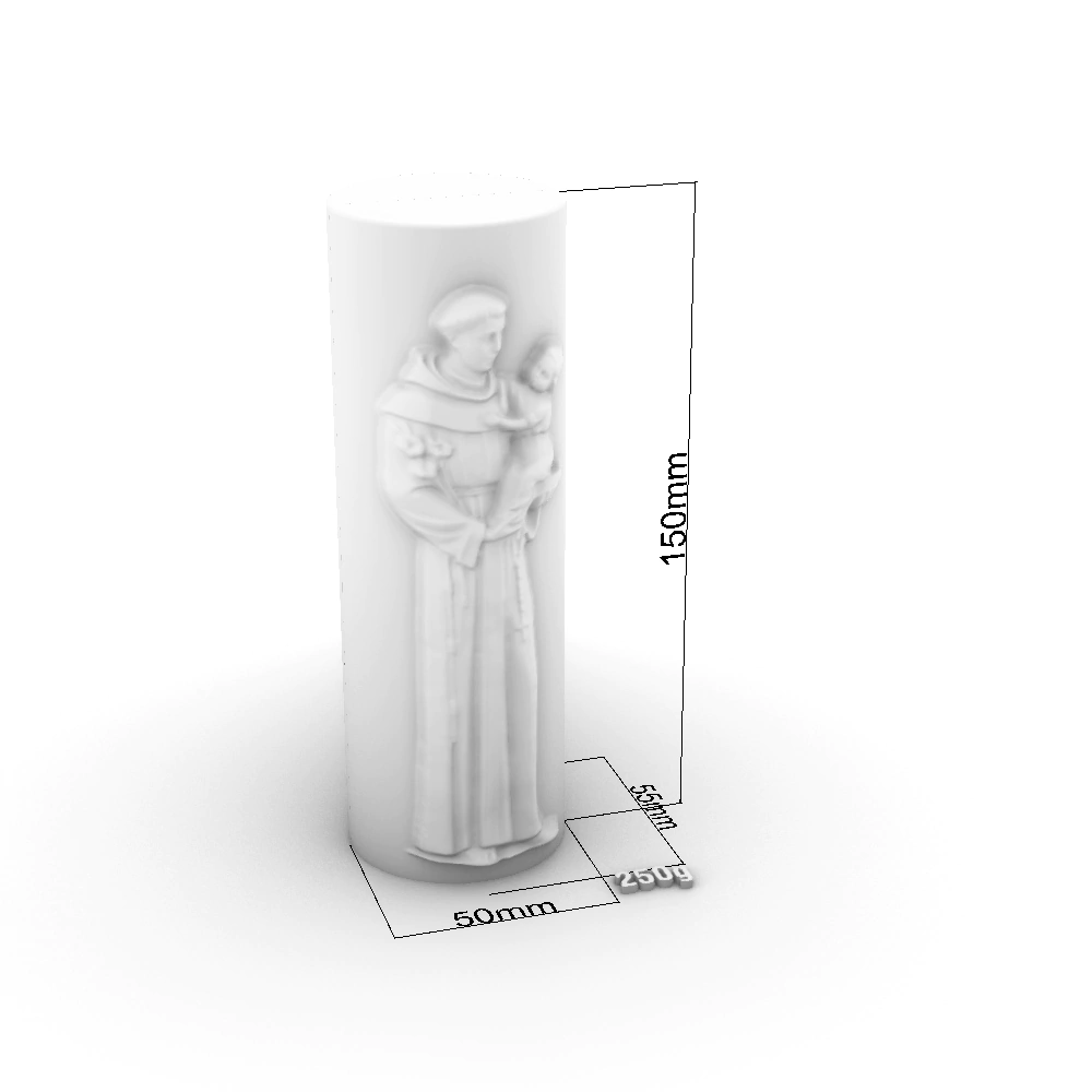 Ilumine sua devoção com nossa vela de sete dias. Apresentamos a forma de silicone cilíndrica com a reverenciada imagem de Santo Antônio em alto relevo. Cada chama queima com fé, enquanto a parte de trás traz a frase em baixo relevo: 'Santo Antônio, rogai por nós! Intercedei a Deus por nós.' Deixe a luz da crença guiar seus dias e noites, enquanto a intercessão do santo abençoa seu lar. Um símbolo de proteção e bênçãos que iluminará sua vida por uma semana inteira.