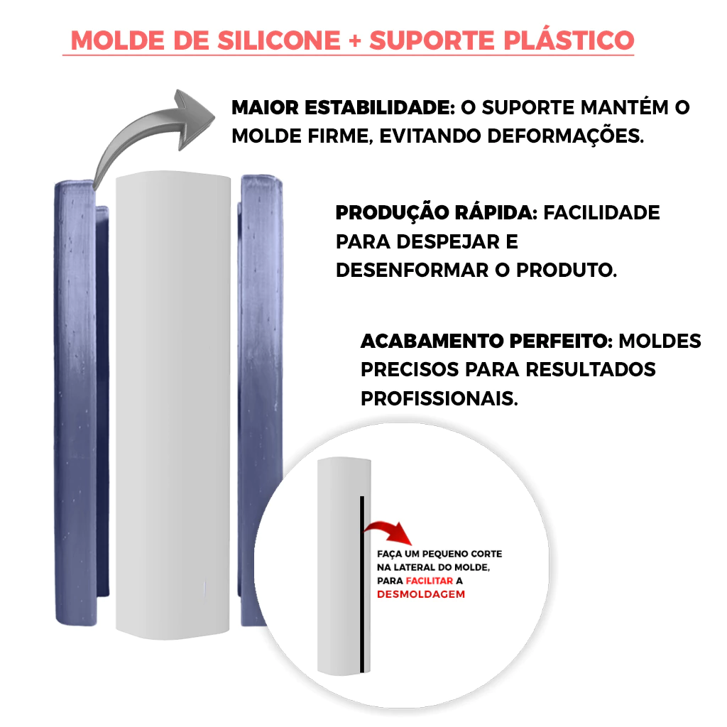 - Alguns modelos, dependendo do formato do corpo da peça, recomendamos que seja feito um corte com estilete na lateral, para que consiga desinformar sem rasgar o molde ou deformar a peça, fique tranquilo você não irá perder sua forma, com um elástico envolva o molde para não vazar o material inserido nos próximos usos.